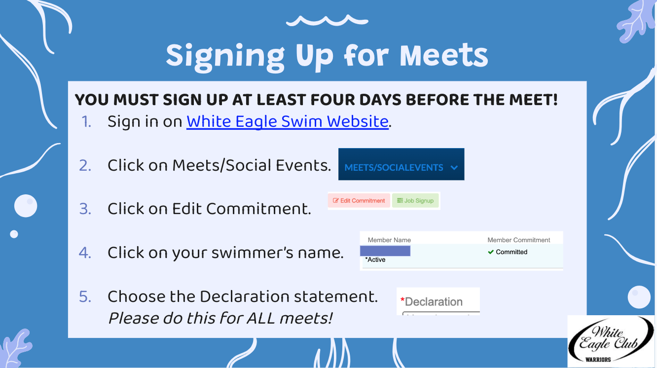 In the event of a change after the meet sign up closes (illness, etc), please notify the Coaches by email via [email protected].