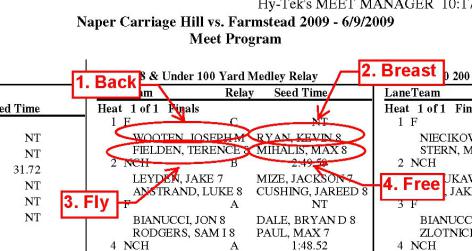 Heat Sheets are a list of all meet events in the order they occur. Visit this link for a complete list. This order is the same at every meet. Please take the time to go over the Heat Sheet and review the races with your child. Helping your swimmers learn how to find their races and lane means they will understand the terminology we are using when lining them up. For the 6 & Under group in particular, explaining how they may be in Lane 1 but Heat 2, for example, will make more sense when we place them in line. Remember, to check for changes after everyone has checked in and Coach has made final adjustments. The picture below shows the order of swimmers for the medley relay. For the free relay, swimmers swim in the same order.