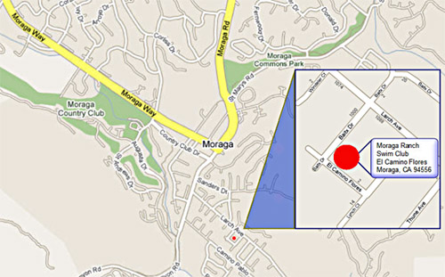 Moraga Ranch Swim Club is located at 8 El Camino Flores in Moraga, California, at the corner of Baitx Drive and El Camino Flores, one block southwest of Larch Avenue.