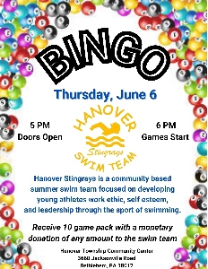 On Thursday, June 6th at the Hanover Township Community Center, there will be BINGO to support the Hanover Swim Team. Doors open at 5pm and games start at 6pm. You will receive a 10 game pack with a monetary donation of any amount to the swi team. Please go out and support our team and pass along to others.