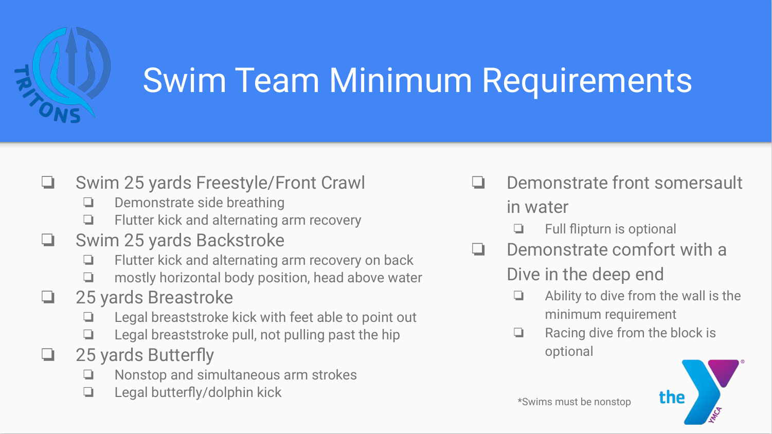 Swimmers in the YMCA swim lesson program must pass Stage 6 of swim lessons to apply for a tryout. Those who have completed a season of high school swim team are welcome to join and tryout during a practice.