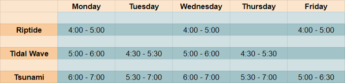 Tsunami: Monday/Wednesday at 6:00-7:00 & Tuesday/Thursday at 5:30-7:00 & Friday at 5:00-6:30