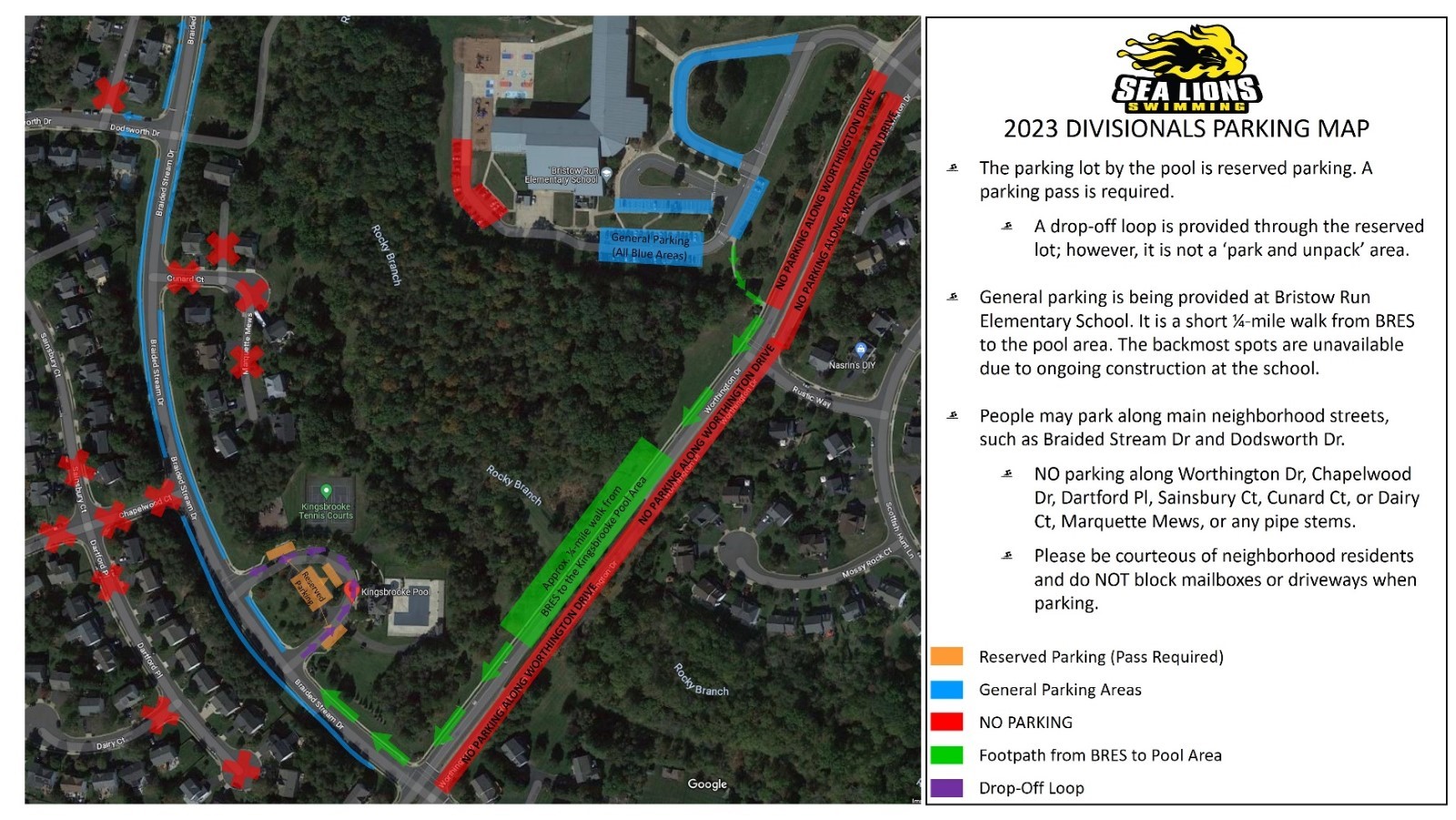 Please use the drop-off area (circle) in front of the Kingsbrooke Clubhouse off Braided Stream Drive to unload swimmers and gear. General parking is available on Braided Stream Dr and Bristow Run Elementary School within short walking distance of the pool. Street parking is available on surrounding neighborhood streets, please respect homeowners and do not park within 15 feet of the driveway or mailbox. PLEASE do not block driveways or mailboxes and be respectful to our neighbors in early mornings with minimal noise. Obey all signs for No Parking. PLEASE DO NOT PARK IN THE GRASS. VIOLATORS MAY BE TOWED AT THE OWNER’S EXPENSE.