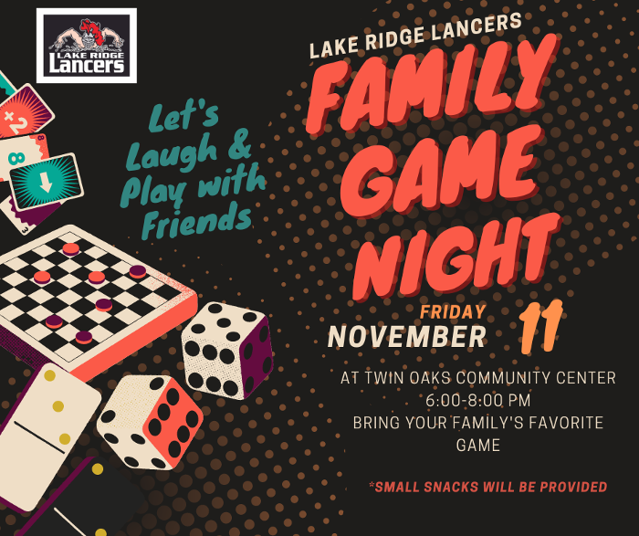 We hope your fall is going well! We have fall conditioning underway and love seeing all of the familiar faces each Sunday, however, we miss the rest of you! For this reason, we have decided to host a FAMILY GAME NIGHT on Friday, November 11th from 6-8pm. This event will take place at the Twin Oaks Farm community clubhouse at 2798 White Birch Court, Woodbridge, VA 22192. Families are invited to bring their favorite game to play with our other swim families. Please note that this is a family event and is not a drop-off event. We can't wait to see everyone!!!