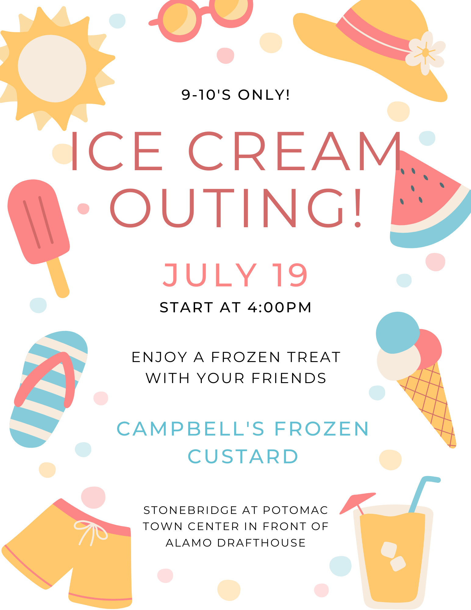 AND THEN, you get to hang out with your 9-10 friends AGAIN on Wednesday, July 19th at 4pm. Meet up with the rest of your age group at Campbell's Frozen Custard at their Stonebridge location (Wegman's Plaza). Eat a delicious frozen treat than have fun on the turf and play in the splash pad!