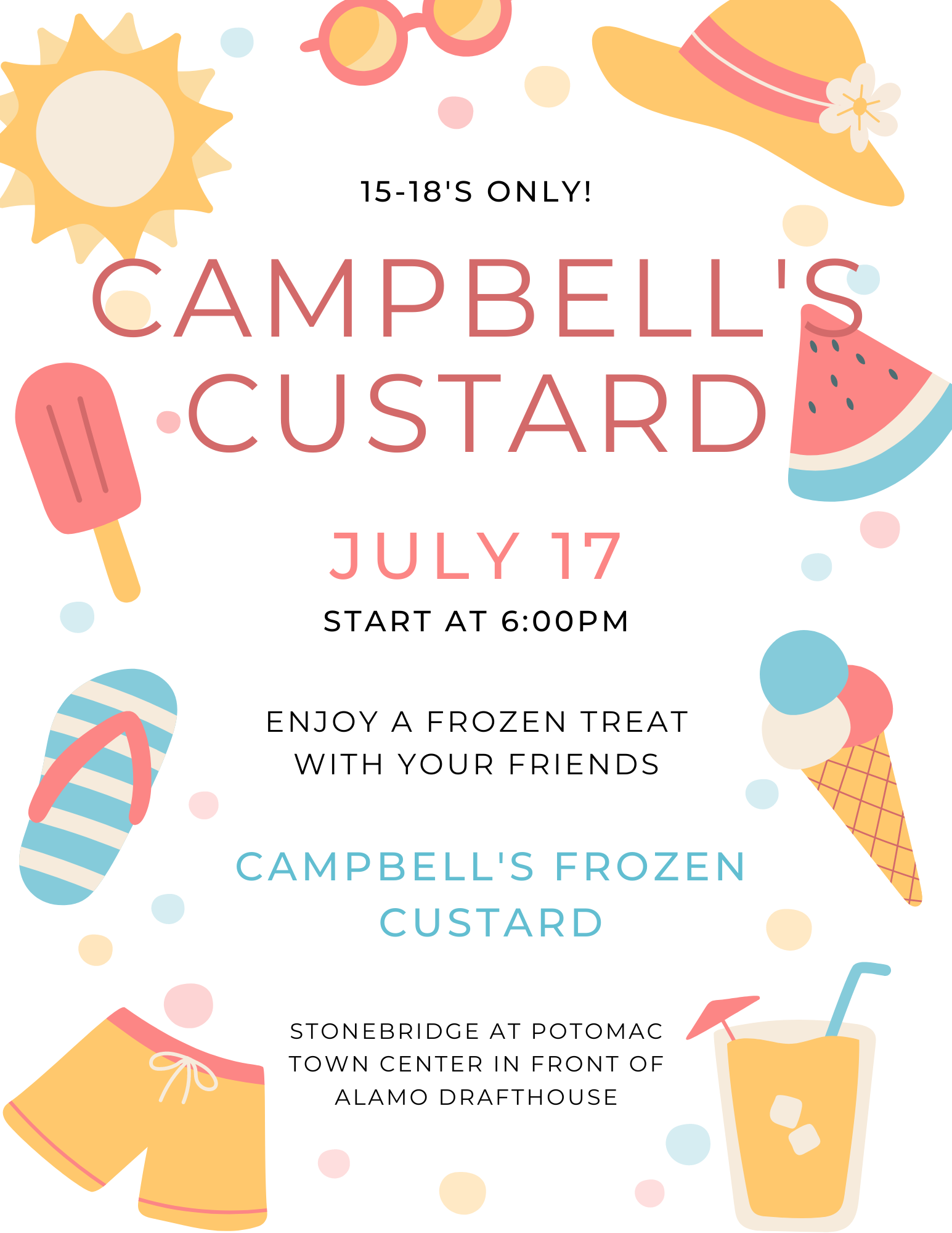 Your age group parent organizers have a fun get together planned for you guys to socialize outside of swim practice! On Monday, July 17th at 6pm, everyone should meet at the Campbell's Frozen Custard in Stonebridge. Get yourselves a delicious treat and spread out on the green with your friends. This will be a great time to relax and hang out without being told to swim a 100 fly. Hope you can make it!