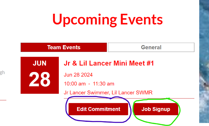 This week we have our very first Jr/Lil Lancer Mini Meet of the season! Please make sure to go onto the website and let us know if your child will be participating and sign up for one of the jobs available to ensure our mini meet can happen. I have included a screenshot of our homepage where you can find the buttons you will need to do that. Off to the right and toward the lower end of our homepage, you'll see our list of upcoming team events. The first event you'll see is the "Jr & Lil Lancer Mini Meet #1". I have circled the "Edit Commitment" button in blue that you will click on to let us know if your child will be swimming in the mini meet or not (please answer either way). I have circled the "Job Signup" button in green for you to choose from the available jobs to help run the meet. You will be taught whichever job you choose so don't be afraid to select something you may not know how to do. NOTE: Snack and drink provider are perfect jobs if you have other littles in tow. Please do these things ASAP so we can get everything planned in time for Thursday. This is exactly what the parents of our competitive team swimmers have to do every week.