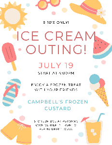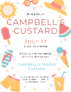 9-10's - Plan to stay and play at the swim club pool this coming Monday, July 10th from 12pm until whenever. Your age group organizers are Gold Members at the club so it only costs $3 to stay instead of $5 that you would normally get with your Silver Membership. Bring lunch to enjoy with your friends! AND THEN, you get to hang out with your 9-10 friends AGAIN on Wednesday, July 19th at 4pm. Meet up with the rest of your age group at Campbell's Frozen Custard at their...