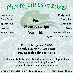 Pool Dues may be paid via online invoice or mailed to: Greenwyche Club, Inc. PO Box 2824 Huntsville, AL. 35804