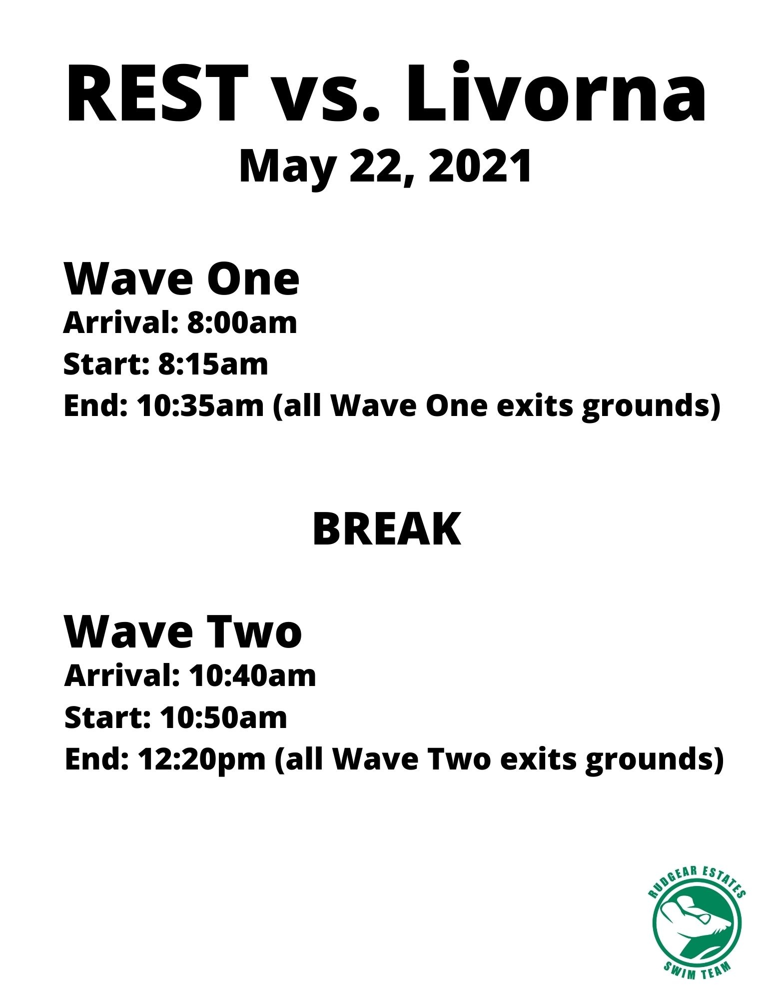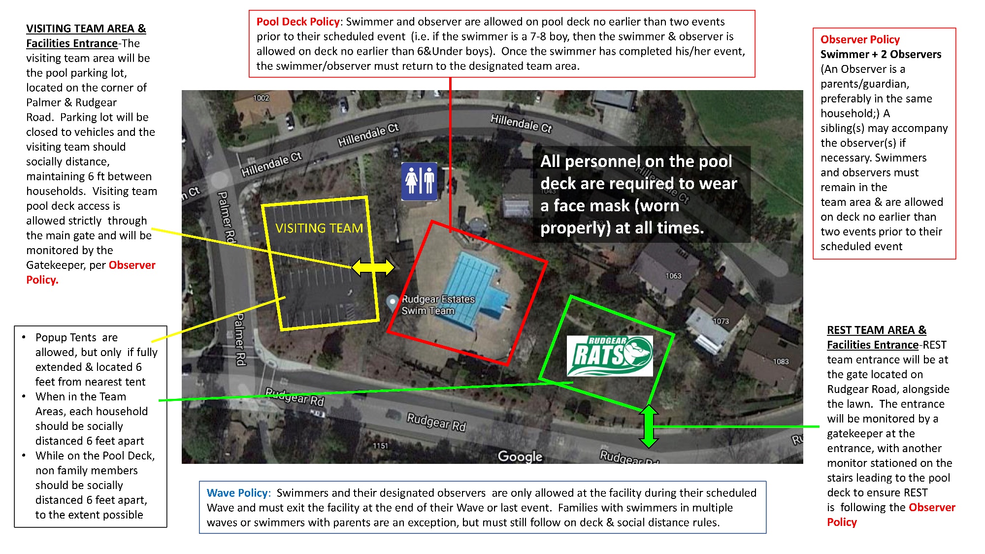 A quick reminder to enter and exit today's meet through the Rudgear Road gate. Also, please remember to keep your mask on at all times and socially distance from non-family members. Please help reminder your swimmers to mask and distance, too.