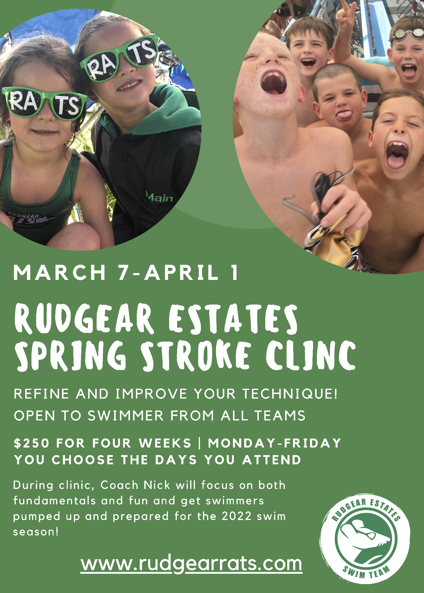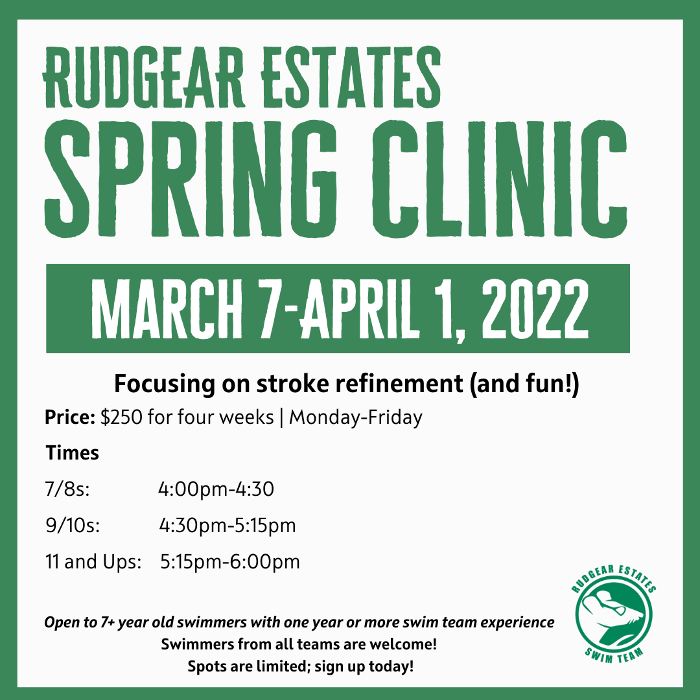 Spring clinic is open to all swimmers, ages 7+, with at least a year of swim team experience - including swimmers from other teams. (Please feel free to share the attached flyers with your friends from other teams, as not every team will be hosting a spring clinic.)