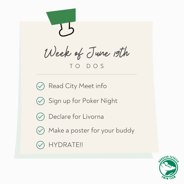 Shoutout to Natalie Puzia for being a legend! Please remember to remain hydrated as this week is supposed to be extremely hot. The main focus of the week is Walnut Creek city meet this coming weekend. Heather Farms is a fast pool, so let’s be prepared to set personal goals and pop our times. Rockin’ Rats theme on Saturday + Bleed Green theme on Sunday.