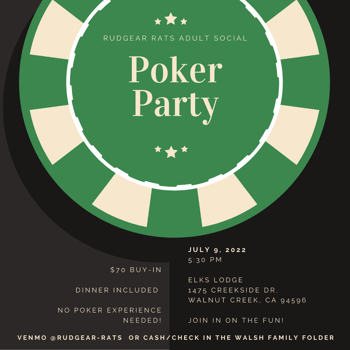 Please join us for the 2022 Rudgear Rats Adult Social/Poker Party! Come hang out with Rudgear parents, play a little poker, and maybe even win some prizes! No poker experience needed to enjoy this fun event. The poker portion of the evening will be run by BlueDog Events and all proceeds raised will go towards supporting our Rudgear Rats swim team. The winner of the poker tournament wins a free pass on jobs for the 2023 swim season!