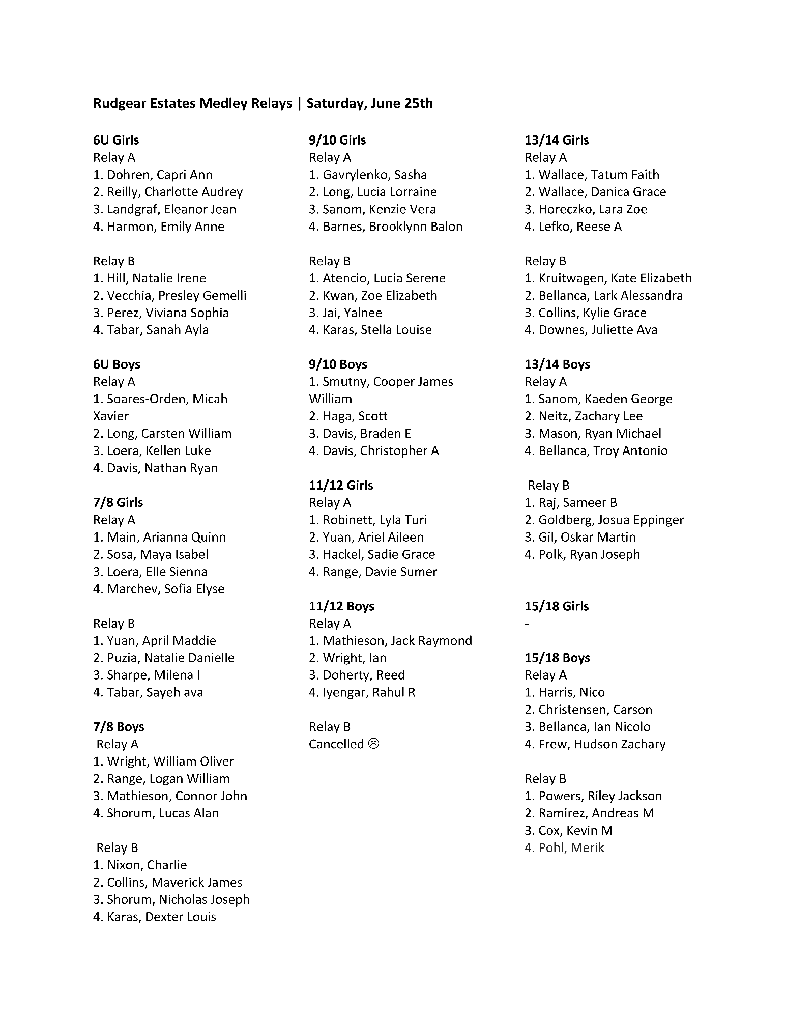We wanted to share the assignments for Saturday's medley relays now. They will also be posted in our team area.