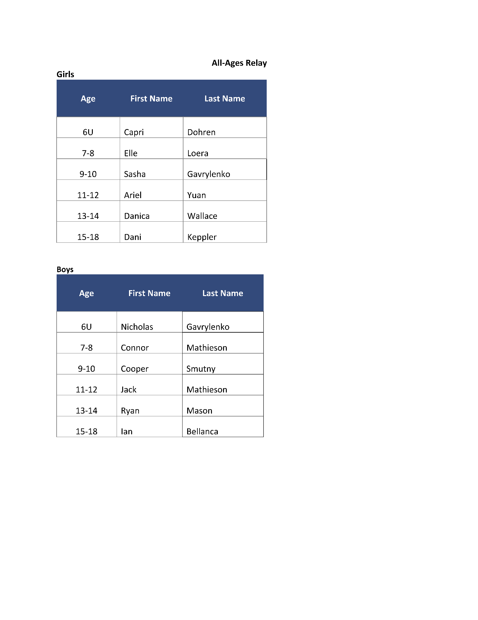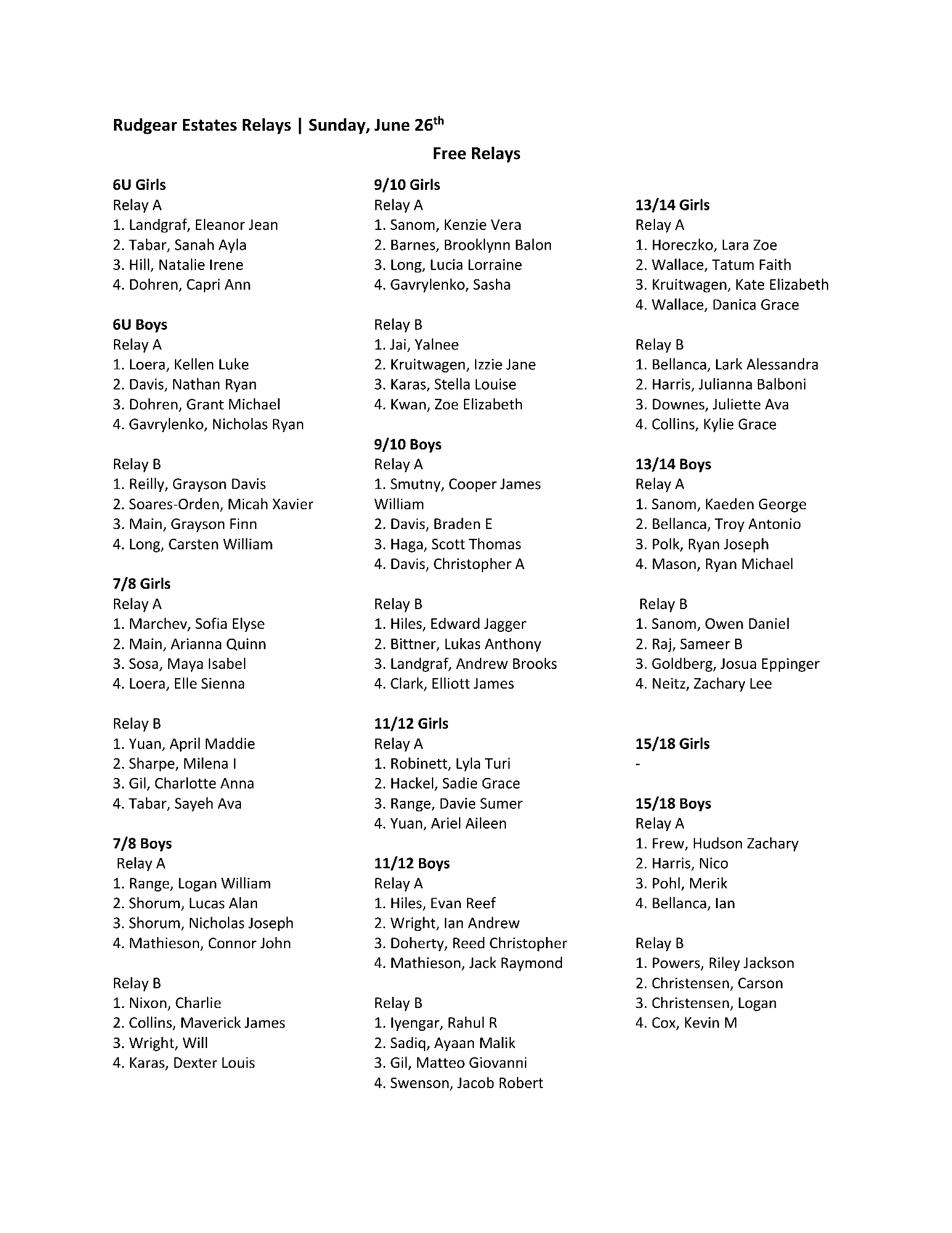 Also, attached are the relay assignments for Sunday - free relays and the all-ages relays. They will also be posted in our team area.