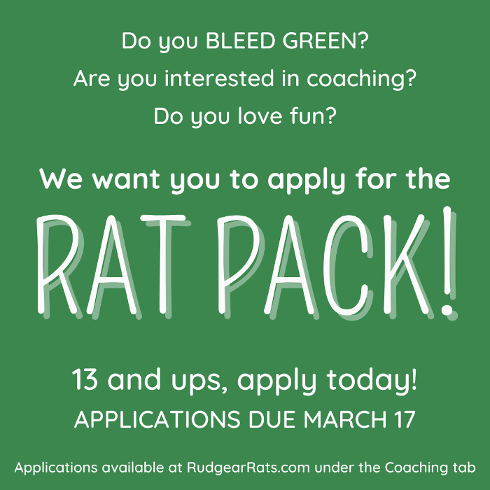 It’s time to submit your application to join everyone’s favorite pack: the RAT PACK! Rat Packers help our younger RATS during practice and meets and help out with Rugrats (formerly Polliwogs). Rat Packers also exemplify our Rudgear spirit and have tons of fun. Please note that Rat Packers must be at least 13 years old. Click here to learn more and to apply.