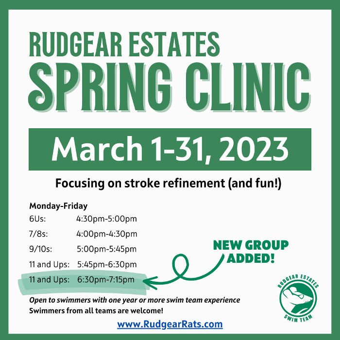 Rain or shine (or snow!), Spring Clinic starts next week over at the Rudgear Meadows pool! If you haven't registered yet, we do still have spots in the Six & Under group and spots for 11 and Ups in the newly added 6:30pm-7:15pm group. Click here to register. We can't wait to see everyone!