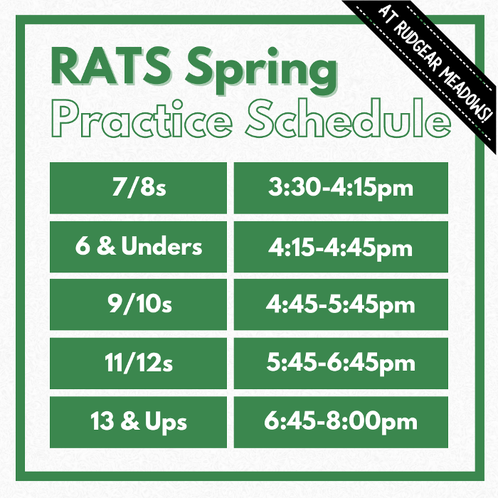 Get excited: practice starts Monday (4/10)! We are so pumped up to see all our Rats in the pool and to kick off another amazing. There is a lot of information below and if you're new to the team or need a refresher, please read everything. If you know the drill and need a summary here it is: Practice starts on Monday, it's at Rudgear Meadows, and the times are below. No practice on 4/12.
