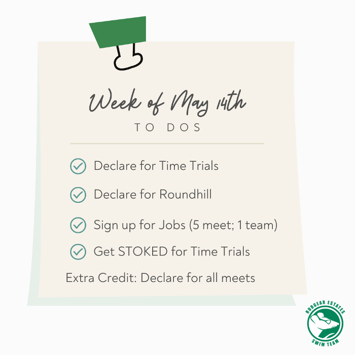 Time Trials is this coming Saturday (5/20)! If you haven’t yet, please sign your swimmer(s) into or out of Time Trials by May 17th. For Time Trials, swimmers swim all strokes so that they can get baseline times for the season. Time Trials is also a great way for swimmers and families to get a feel for meets.
