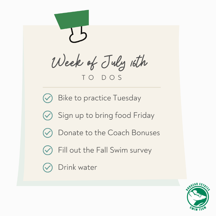 The moment we’ve all been working towards. This week is officially Hell Week! Please have swimmers bring socks and shoes in case we do running + workout exercises. It’s going to be hot outside, please send swimmers to practice with water + healthy snacks! Let’s also work on resting outside of swimming, and limiting next week’s extracurricular activities…
