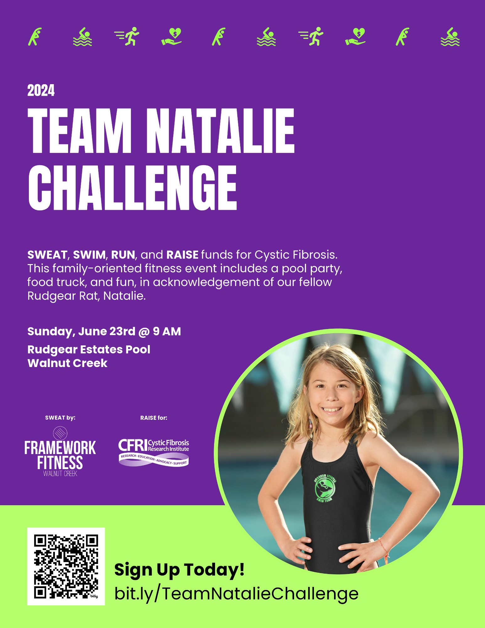 May is Cystic Fibrosis* Awareness Month. The Team Natalie Challenge is an annual community fundraising event put on by a group of Rat parents. Fifty two-person teams SWEAT, SWIM, RUN, and RAISE funds for the Cystic Fibrosis Research Institute." Let's pool our strengths as Rudgear Rats and use this challenge to raise much-needed funds for research while showing support for our fellow RAT, Natalie, who lives with CF.
