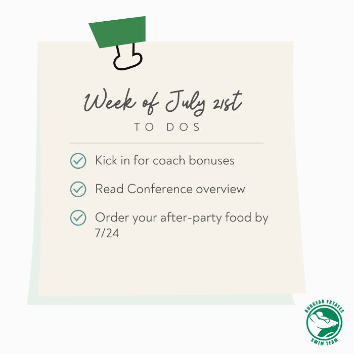 The Conference After Party is the place to be! After relays and awards on Sunday, head on over to Rudgear Estates to eat, drink, swim, and dance with our Rudgear Fam! All are welcome! Be sure to opt in and pay for catered food and drinks (yummy Mexican food!) – orders due by July 24th. (If you choose to BYO food and drink instead that’s also totally fine.) This is one of the best nights of the season; you won’t want to miss out!