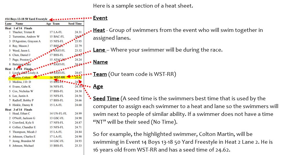The heat sheet is a meet program with all of the events listed in the order they will be appear, the number of heats per event, and the lane assignments for your swimmer. Heat sheets will either be sold at the event or sent in an email for download. The host team determines how the heat sheets are distributed.