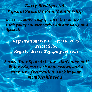 Early Bird Special: Summer Pool Membership Ready to make a splash this summer? Get your spot at the pool before everyone else with our Early Bird Special! Registration Opens: February 1 – April 18, 2025 Price: Only $550 Secure Your Spot: Don’t wait—Get ready for summer!! Enjoy 7 days a week access to our pool, and a whole summer of relaxation. Lock in your membership today! Sign up now and dive into summer fun! Register Here SwimAmerica Swim Lessons at Topspin are open for...
