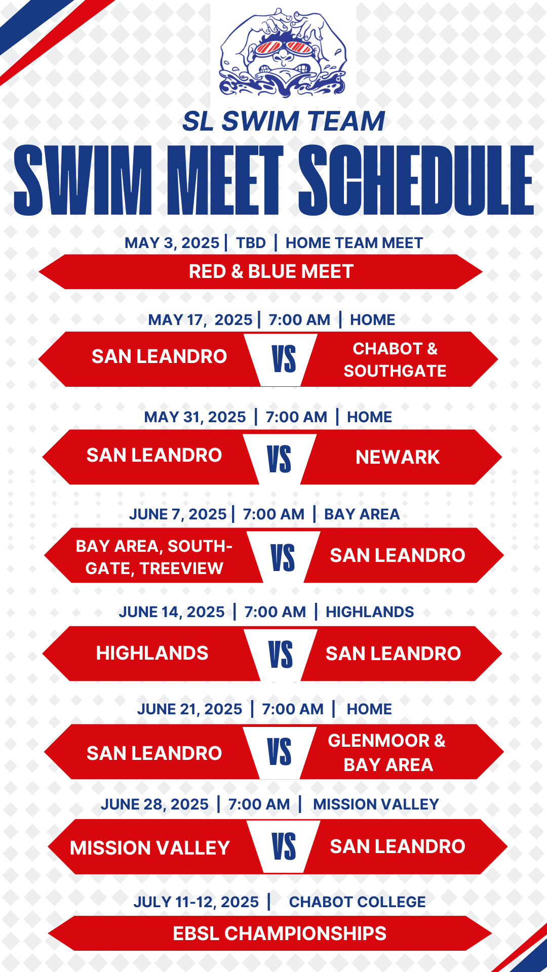 Thursday, March 27 - Due to a SLHS swim meet, practice will not begin until 6:45pm. We will run a combined practice at this time for ALL SWIMMERS. Expect the oldest swimmers to finish around 8pm.