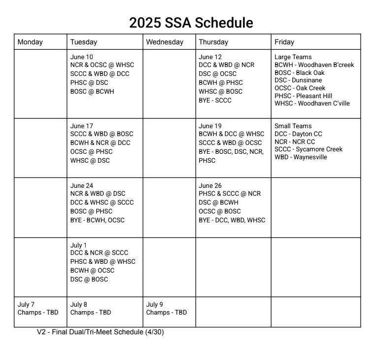 Here the Current Swim Meet Schedule - More information to come on Championships but Meets are Tues/Thur still with Championships to be the week of July 7th