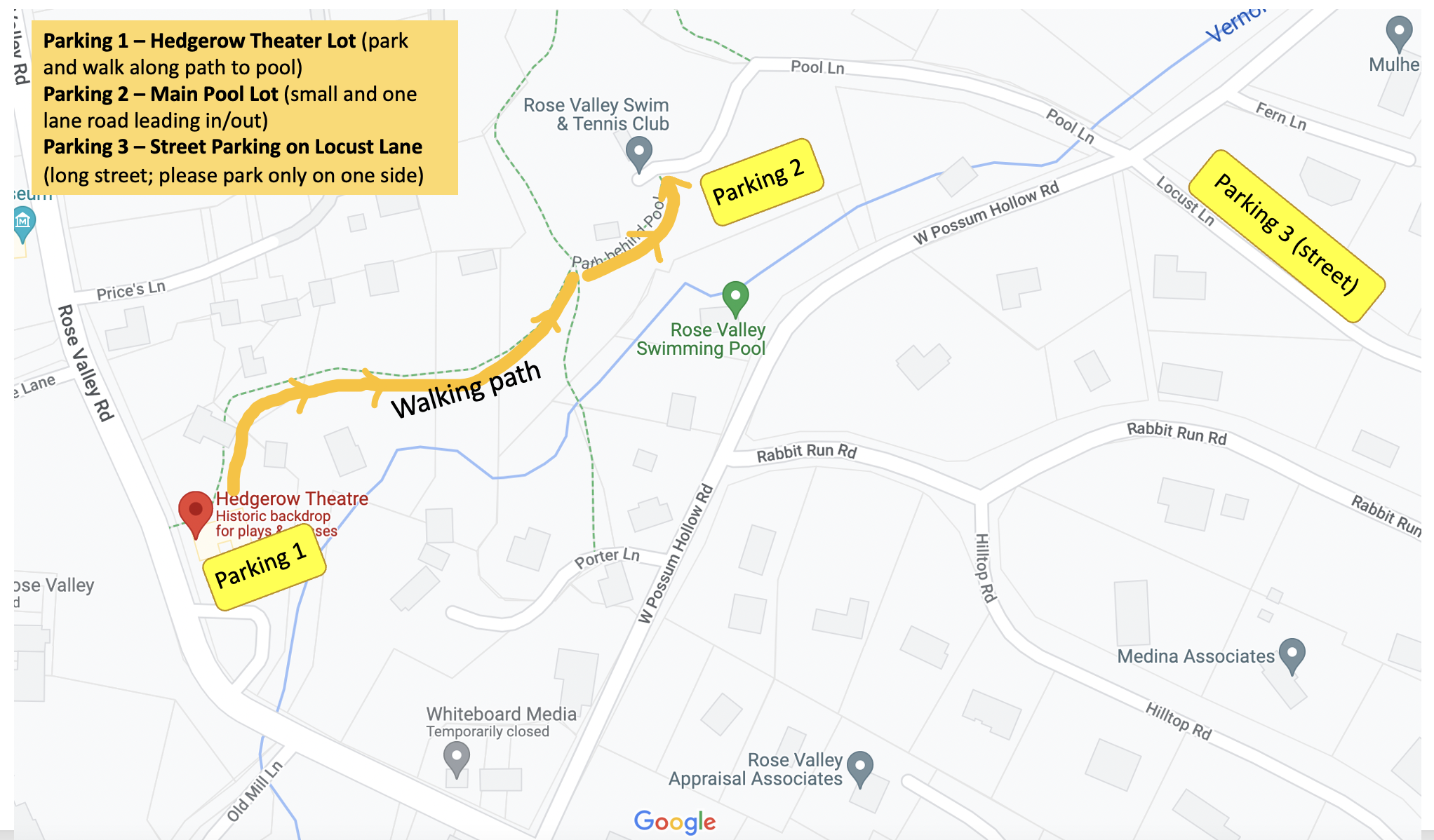 Parking is going to be VERY TIGHT! Please park in one of the three locations marked on the map below. Try to be safe but efficient. Rose Valley is trying to leave parking area 2 open for Hidden Hollow as it is the closest. They will have volunteers helping to coordinate parking; please be respectful if they ask you to move. They have fire/emergency regulations in the main pool parking lot that they have to abide by and neighbors to be respectful of near our on street parking.