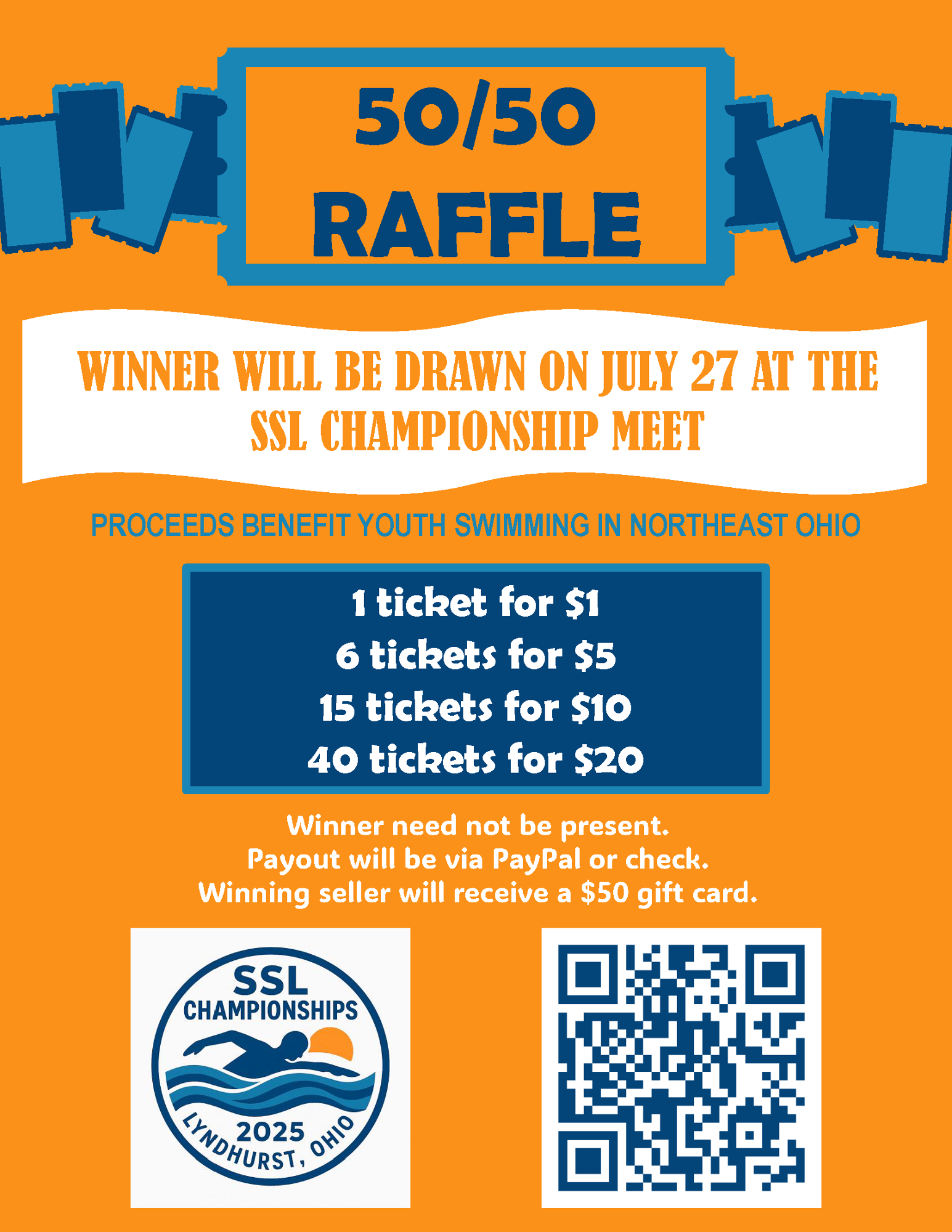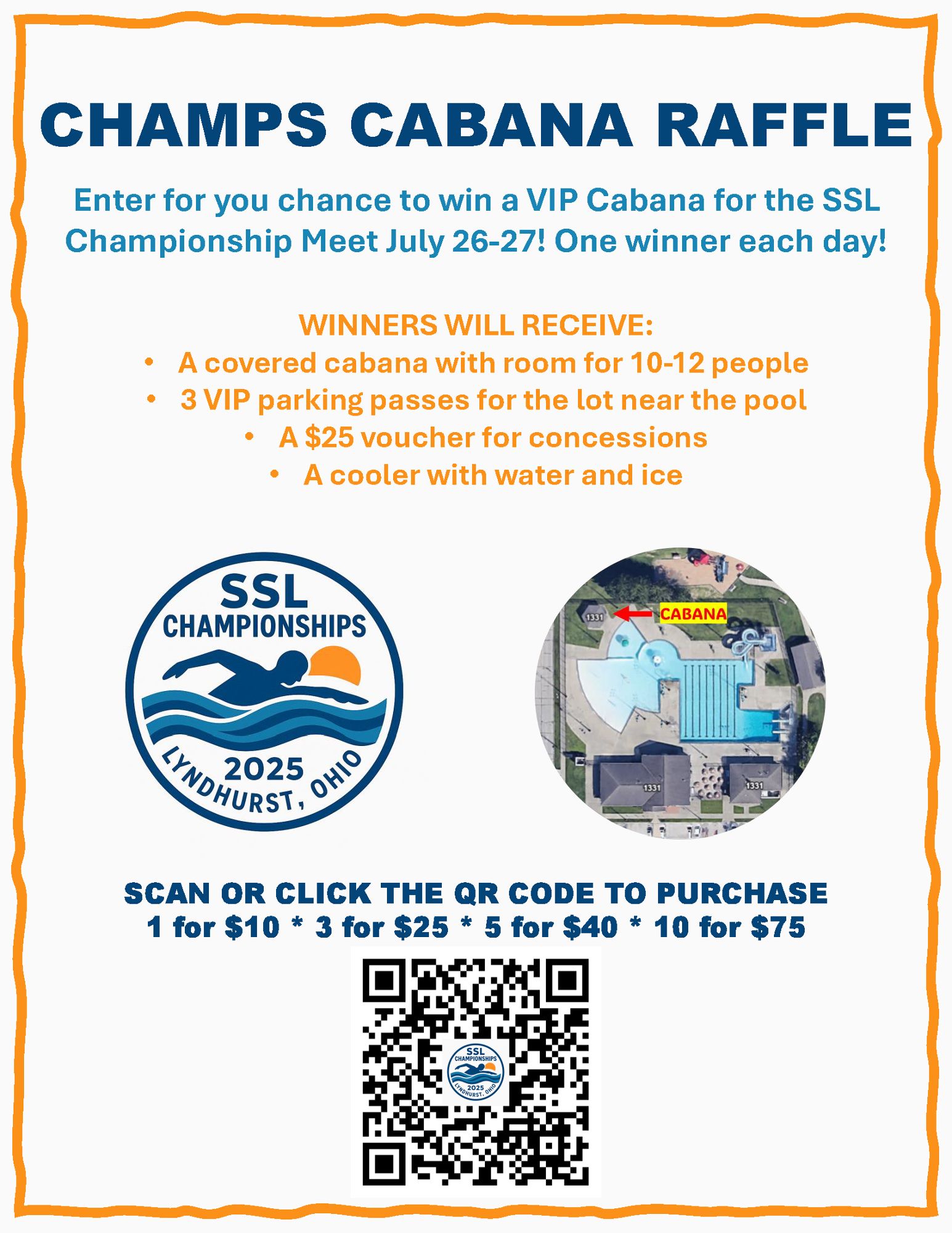 Please see attached for separate flyers for the cabana raffle and 50/50 raffle for this year's SSL championship meet on July 26-27.
