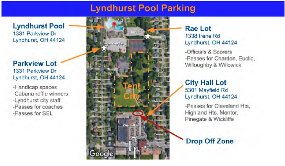 The Lyndhurst Pool (1331 Parkview Dr) has two adjacent parking lots, each of which will be permit-only lots. Lyndhurst Park will serve as tent city, and the Lyndhurst City Hall lot, adjacent to Lyndhurst Park, will provide additional permit-only parking. Permit parking lots will open at 6:00am each morning. A state-issued handicap parking placard or license plate will be required to utilize handicap parking, available in the Parkview Lot.