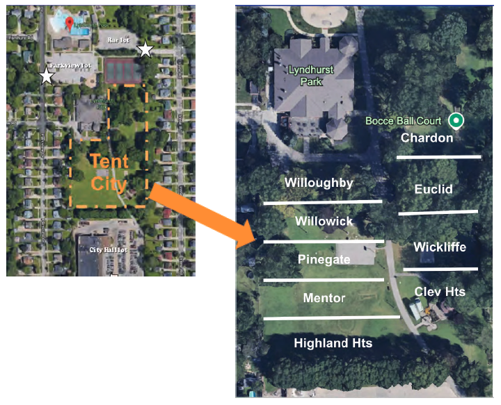 The majority of attendees will be required to park on side streets, and are expected to do so in accordance with city parking laws. The decision to park in violation of city laws is done at the driver’s risk, with illegally parked vehicles subject to towing at the owner’s expense. Ken’s Auto Service (440.442.0166) is utilized by the City of Lyndhurst. A drop off zone will be located on the north end of the CIty Hall lot, next to tent city, as detailed in the map below.