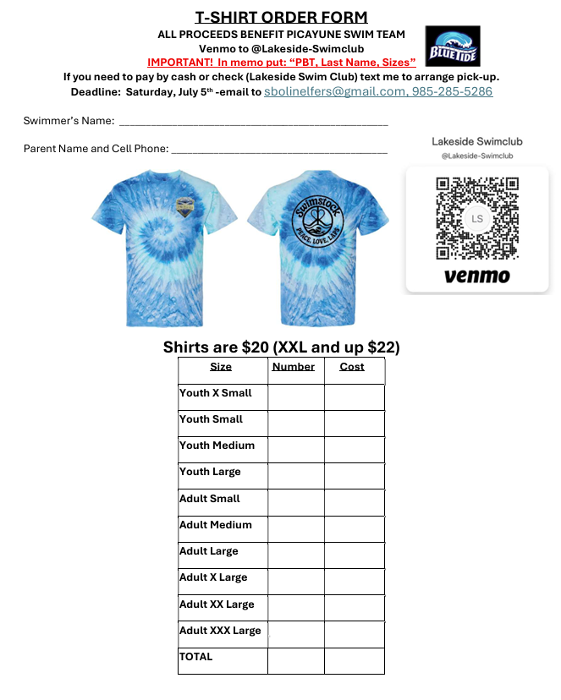 Hey Gator Nation! I know Lakeside will show the love as we raise funds for Picayune Blue Tide, another team in our league! These shirts are super cute with the league logo on the front pocket and the Swimstock graphic on the back! All orders must be in by July 5th! Let's show the love, Lakeside!