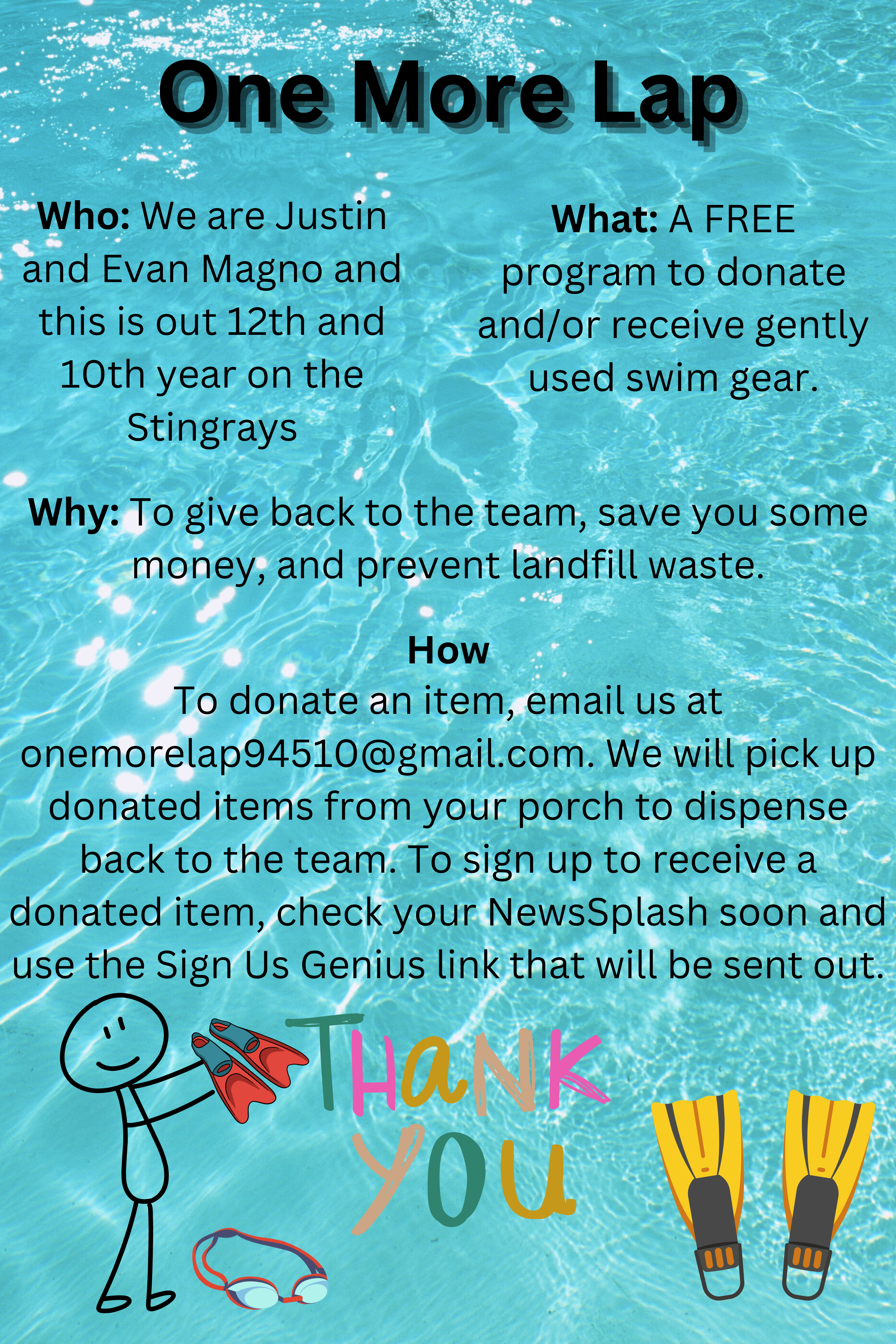 - One More Lap is a program run by Stingray swimmers, Justin and Evan Magno. They will collect gently used swim gear from you to redistribute for free back to the team. If you have gently used swim gear to donate to this program, please email them at [email protected] and they will pick up donated items from your porch. A SignUp Genius Link will be sent out shortly with available items.