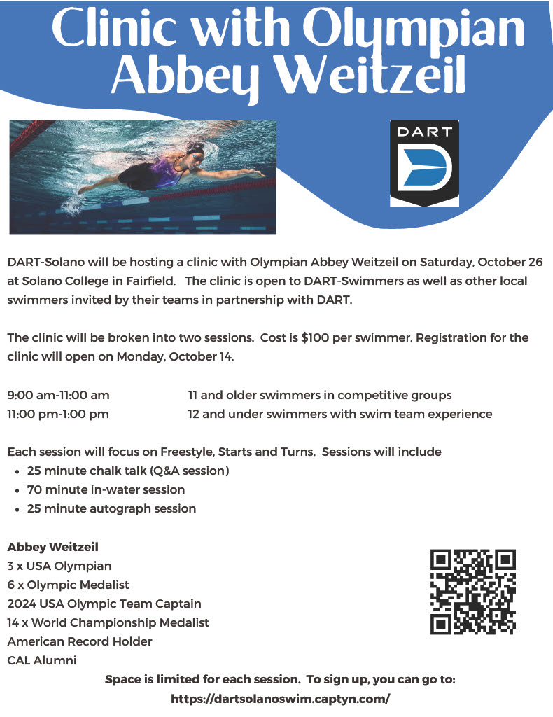 If your swimmer is so sad that Fall Swim is officially over today, here is one more chance for them to get in the water this year! DART Solano Swim Team is hosting a swim clinic by Olympian Abbey Weitzeil. See below for info. This clinic is not affiliated with the Stingrays so all question should be directed to DART Solano Swim.