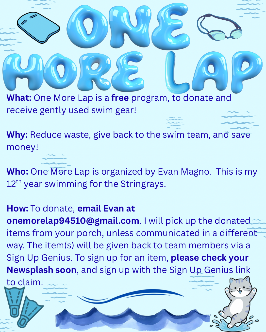 - It is time to clean out your closets and backpacks of too-small fins, swim backpacks, spirit wear, and team suits! As always, Evan Magno is collecting used swim gear to donate back to the team for free. He will organize everything on a Sign Up Genius, and we will send out the link for Sign Ups before the season starts. Everything is free, so please participate if you are able!
