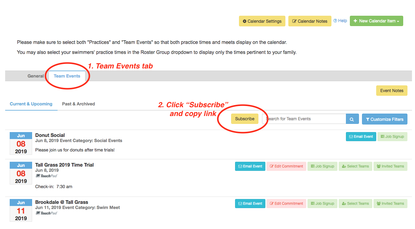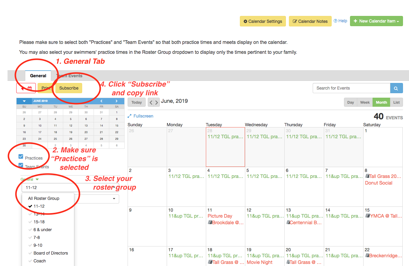The instructions below outline how to subscribe to practice times first, and then to meets/events next.