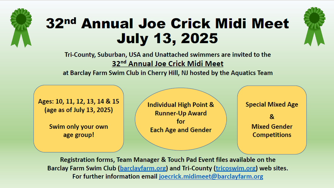 The 32nd Annual Joe Crick Midi Meet at Barclay Farm Swim Club is a swimming meet for children ages 10 through 15 and will be held on Sunday, July 13th, 2025. The Joe Crick Midi Meet provides swimmers from across the Tri-State area to compete in age-specific events, mixed age/gender relays, and in events not typical of league meets. The focus is age specific swimming to push a new distance or try a new stroke. Swimmers are encouraged to sign up through their team or can join individually…if your swimmer is age 10 to 15 on July 13th, the Joe Crick Midi Meet is the meet for them