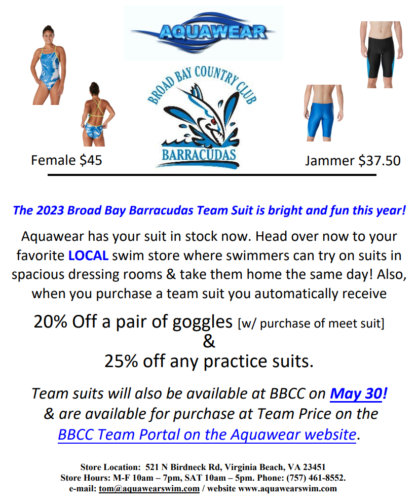 Aquawear will come to BBCC with team suits, goggles, caps, practice suits and accessories for sale. Date: May 30. Suits/gear may also be purchased directly from Aquawear at any time. Girls' suit: $45; boys' jammer: $37.50. To purchase directly from Aquawear online, visit https://aquawearswim.com/team-portal/broad-bay/