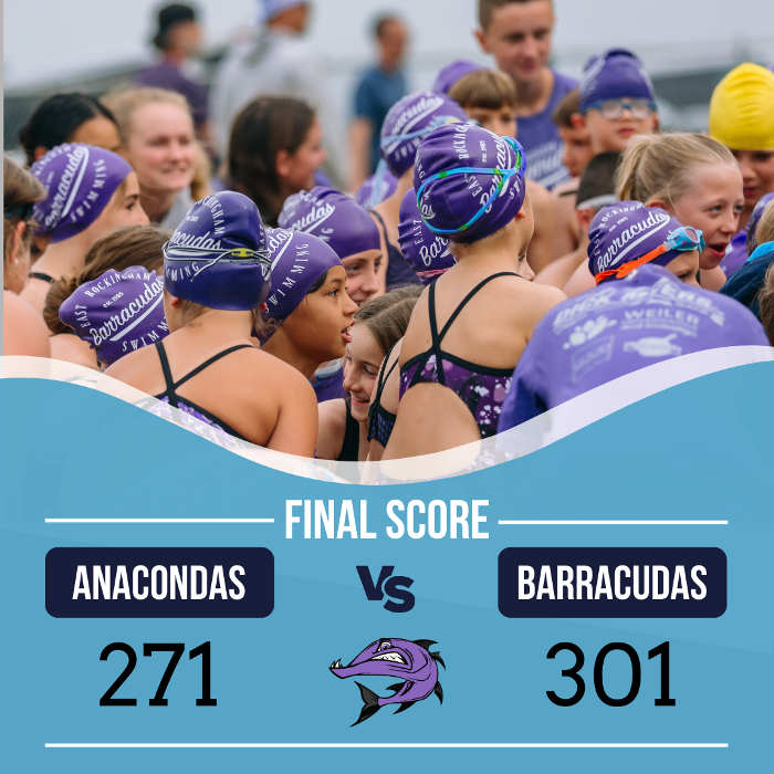 What a great first meet! Some great first swims and time drops. There were over 234 individual races last night and out of those, 96 were BEST TIMES!! Add in 64 relay legs - and there was a lot happening on deck. The score was back and forth all night long with the Barracudas squeezing out a win: Ashby: 271 | ERRA: 301.
