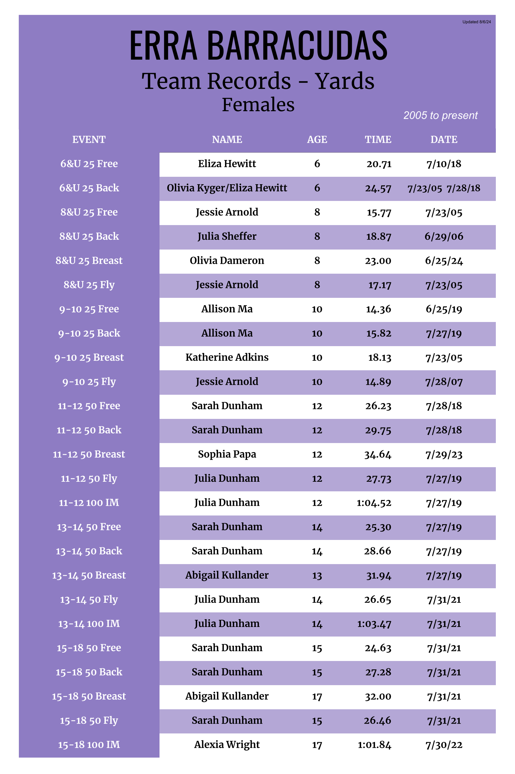| Girls Individual, Yards (08/24) |