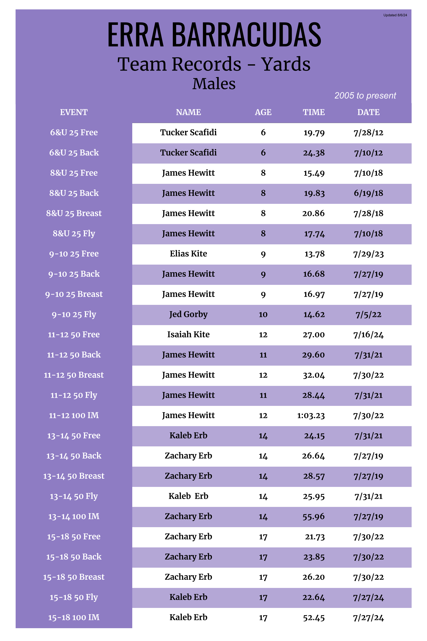 Below you'll find the current records that have been set since 2005. These are updated as often as we are able, but usually by the end of the season after Champs. *Updated 8.31.24