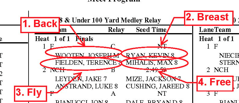 Medley Relay ‐ Read the meet sheet in this order to determine what stroke - (1) top left, (2) top right, (3) bottom left, (4) bottom right. Back, Breast, Fly, Free. (6&U and 7/8s - Back starts on side with timers, Breast starts away from timers, Breast starts on side with timers, Free starts on side away from timers).png)
