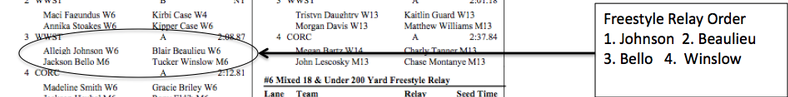 Free Relay - Swimmers swim in this order: top left, top right, bottom left, bottom right. (6&U and 7/8s Top Left and Bottom left start the timer side). All swimmers swim freestyle.