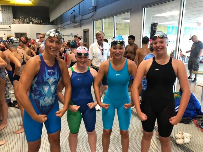 1. The 15-18 year old Women's 200 Yard Medley Relay, featuring Grace Kozlowski, Lauren Bednaroski,Sara Merkelz and Elizabeth McAuliffe. 2. The Trails Swim Team has a roster of 128 swimmers from age 4-18.