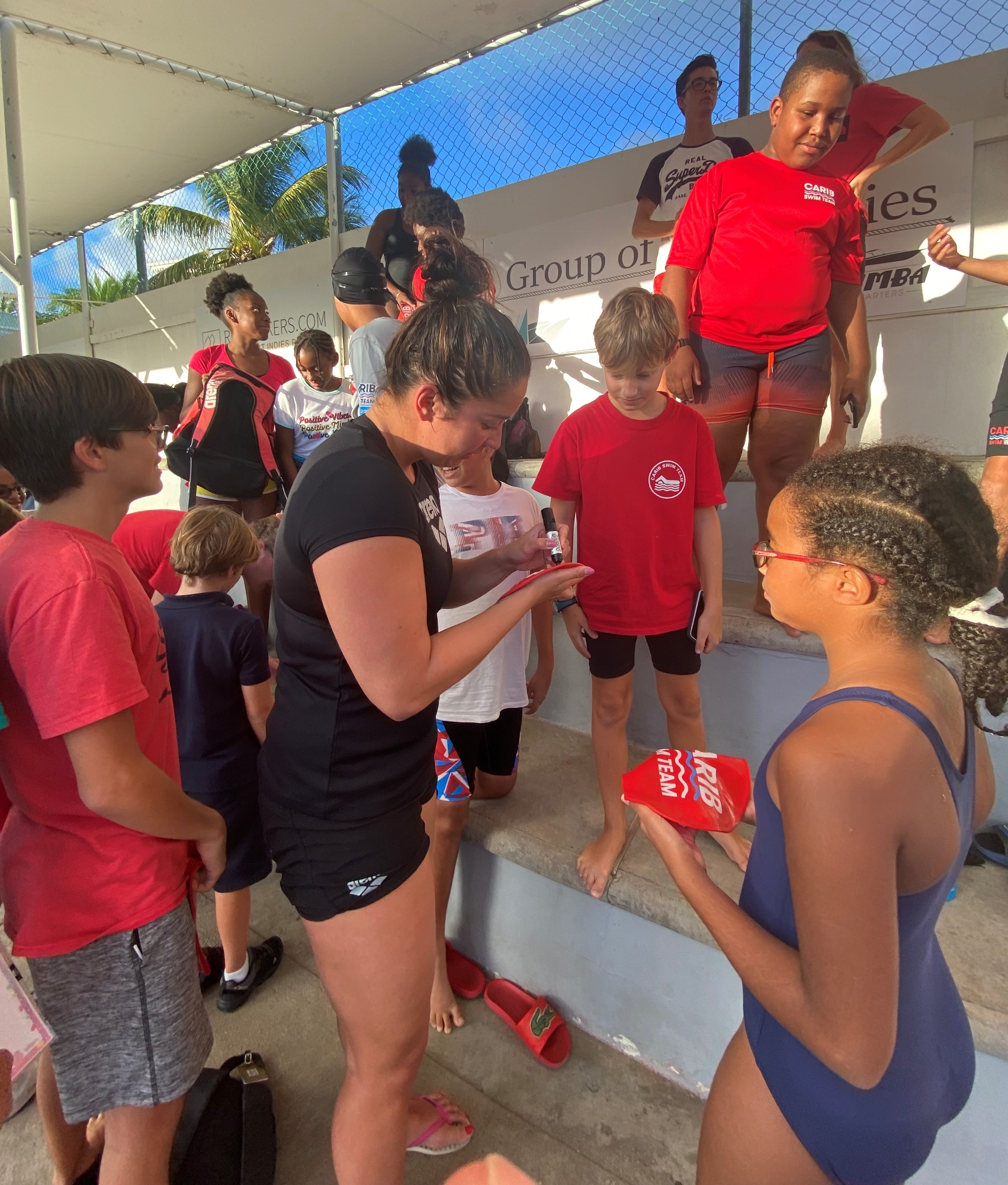 Both Ranomi and Ferry recently announced their retirement from competitive swimming, and were vacationing in Sint Maarten. They were nice enough, on their last afternoon on the island, to come to the Carib Swim Team pool and share their experiences with young swimmers. They told stories, answered questions, took pictures with the young athletes, and signed autographs. They are engaged to be married, and are truly one of competitive swimming’s power couples.