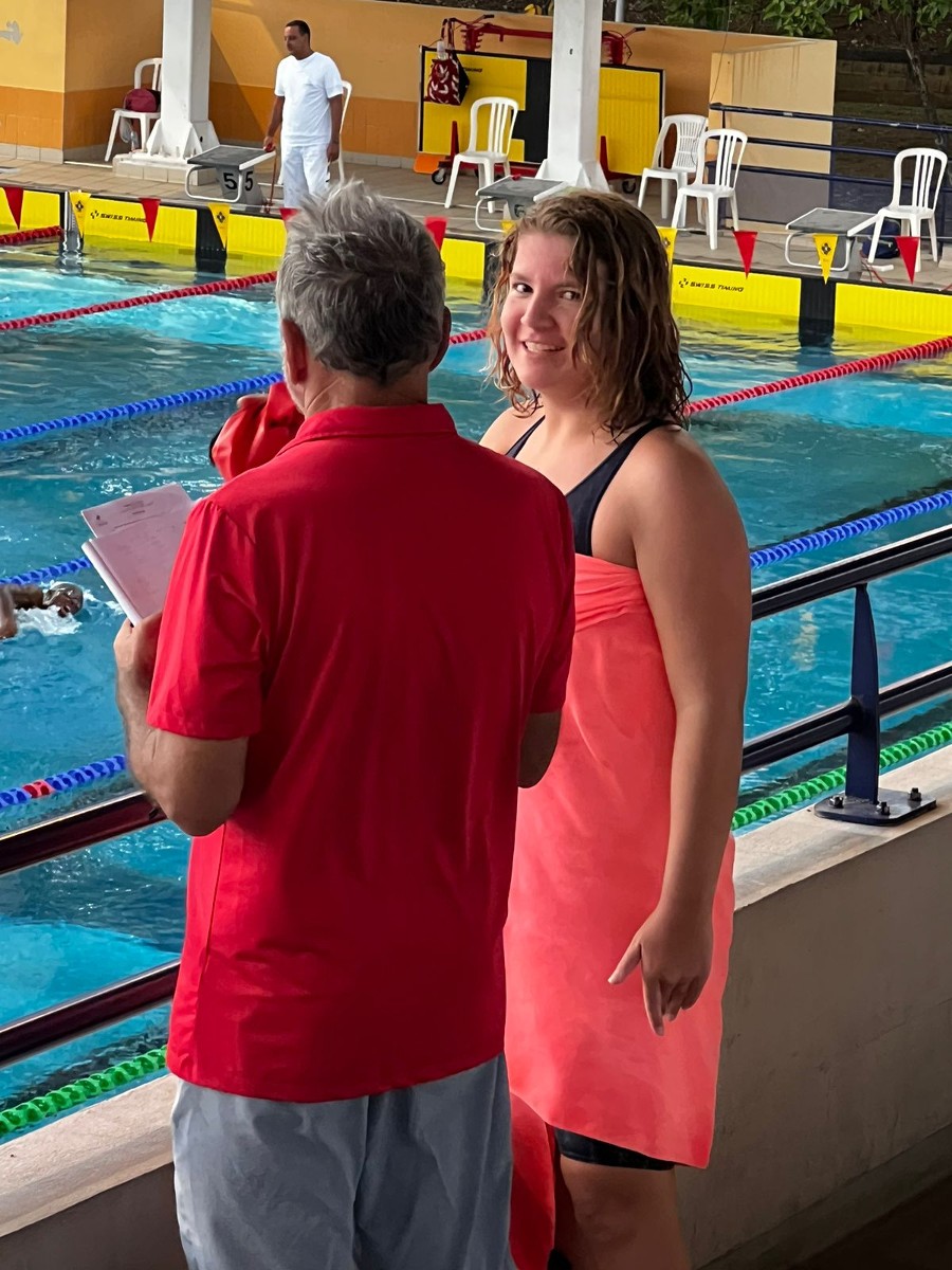 For the boys, Joey (13 years) broke records in the 200 back (2:35.94, also an overall team record), 200 breast (2:55.10), and 400 IM (5:29.76). Matias (15 years) reset team records in 100 free (57.09), 200 free (2:07.23, also a new overall team record), and 800 free (9:16.14, also an overall team record). Brandon Girier Dufournier (16 years) set five new team records, 200 free (2:52.33), 400 free (6:12.42), 50 breast (41.41), 100 breast (1:34.54), and 200 breast (3:34.18).