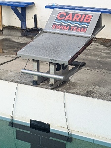 These new wedge blocks help bring the CST pool into a new age of competitive facilities. These blocks feature, of course, the wedge at the back of the block, and also a backstroke ledge. Our coaches will work with our swimmers on how to use these prior to our next meet. CST wishes to thank St. Maarten Timeshare Association, who made a generous donation that allowed us to puchase these blocks. We also wish to thank Ady and Franck for taking a lot of their time to fix the wood...